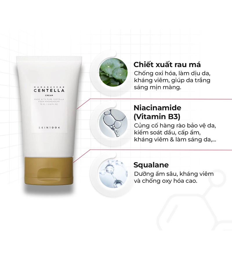 Điểm đặc biệt của sản phẩm nằm ở thành phần chiết xuất rau má Madagascar, giúp làm dịu da, giảm kích ứng và phục hồi da tổn thương hiệu quả. Kết cấu kem mỏng nhẹ, dễ dàng thẩm thấu, không gây nhờn rít hay bí tắc lỗ chân lông.
