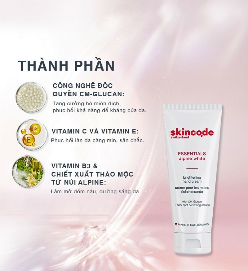 Công thức độc đáo chứa Niacinamide, phức hợp có nguồn gốc từ thực vật Alpine giúp giảm thiểu sự xuất hiện của các đốm đồi mồi. Cũng như Vitamin C và E để bảo vệ bàn tay khỏi các tác nhân môi trường mà chúng phải tiếp xúc hàng ngày. Dưỡng da tay trắng hồng, mịn màng hơn mỗi ngày. Kết cấu mịn mượt nhanh chóng thấm sâu vào da để nuôi dưỡng và hạn chế bong tróc, nứt nẻ da tay. Ngoài ra, sản phẩm còn tích cực giảm thiểu sự xuất hiện và làm mờ đốm nâu sạm đen, giúp da sáng mịn và đều màu. Đồng thời phục hồi sức đề kháng của da, tái tạo độ căng mịn đàn hồi của da tay, giảm nếp nhăn và bảo vệ da tay khỏi tác nhân gây hại từ tia bức xạ và ô nhiễm. Với Skincode Brightening Hand Cream, đôi tay của bạn sẽ được bảo vệ và chăm sóc đúng cách, từ đó giúp bạn tự tin trong mọi hoạt động hàng ngày.