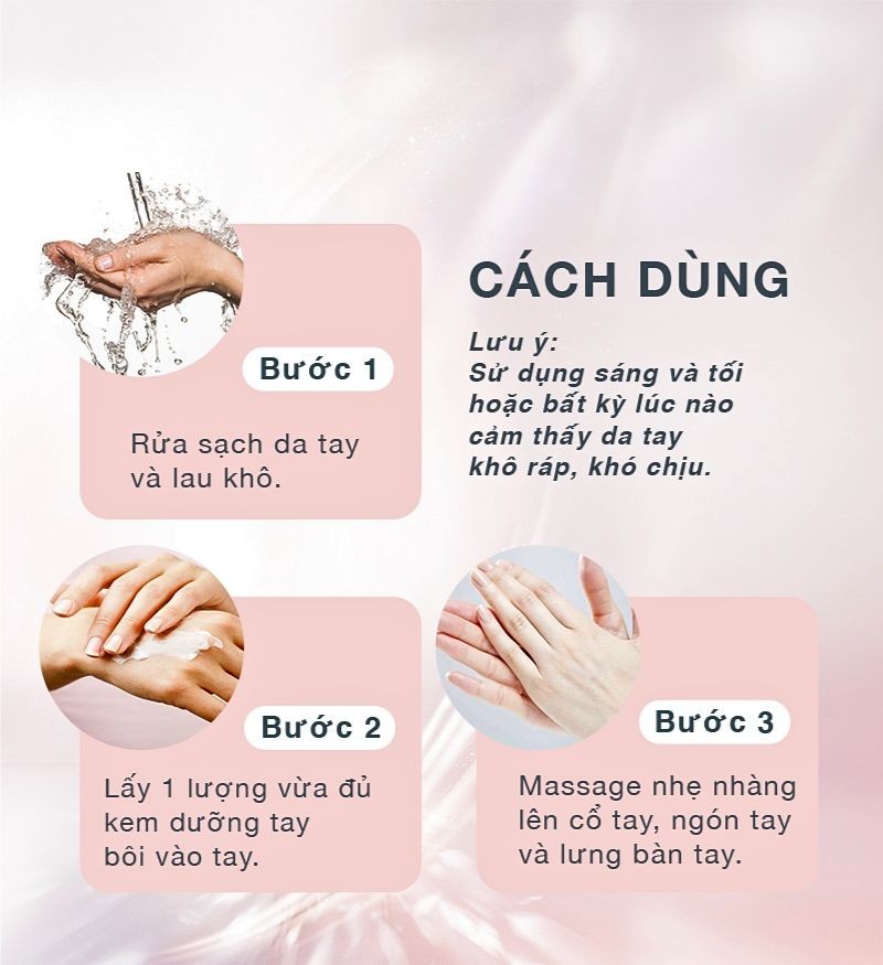 Cách sử dụng 2 lần/ngày hoặc bất cứ lúc nào thấy da tay bị khô ráp khó chịu.