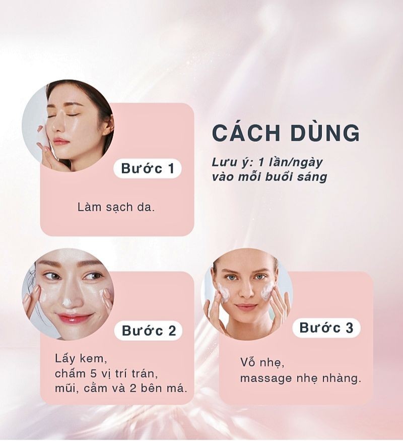Sử dụng mỗi buổi sáng sau bước sữa rửa mặt, nước hoa hồng và serum.
