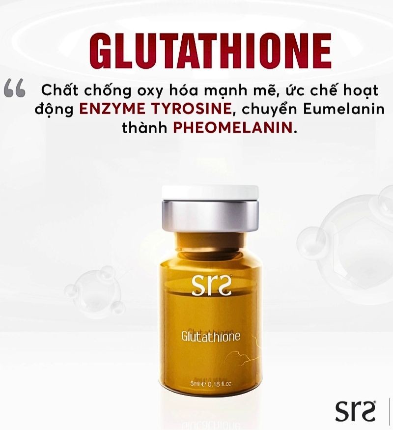SRS Glutathione gồm Glutathione 20% cùng dạng tinh chất mỏng nhẹ đi sâu vào tế bào, giúp ức chế quá trình sản sinh melanin, cũng như điều hòa các hắc sắc tố da. Kích thích tái tạo tế bào mới, trắng sáng và khỏe mạnh hơn. Ngoài ra, sản phẩm còn chống oxy hóa mạnh mẽ, làm chậm quá trình lão hóa, hỗ trợ liên kết chặt chế lớp biểu bì dưới da giúp da tươi trẻ, hồng hào hơn.
