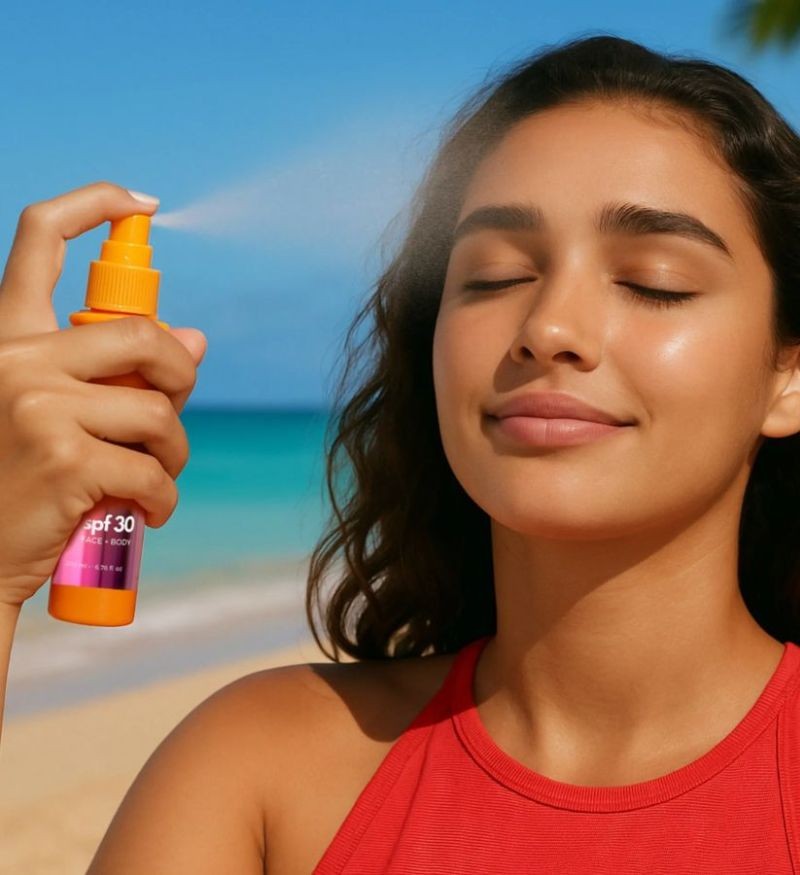 Bước 2: Xịt đều lên vùng da mặt và cơ thể cần bảo vệ. Đối với mặt, nên xịt ra tay trước rồi vỗ nhẹ lên da. Thoa lại sau 2 - 3 giờ hoặc khi khi đổ mồ hôi hoặc bơi lội. Thoa kem trước khi ra nắng 15 - 20 phút.