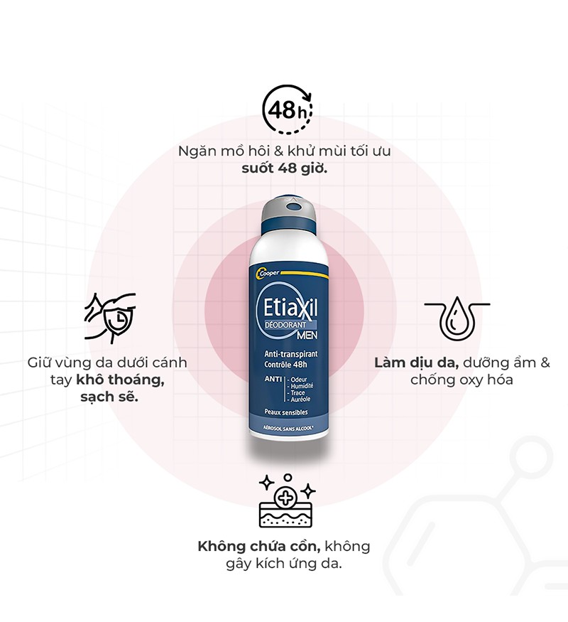 Etiaxil Men 48H là xịt khử mùi chuyên biệt dành cho nam giới, giúp ngăn mùi & kiểm soát mồ hôi hiệu quả suốt 48 giờ. Với công thức đặc biệt dành riêng cho nam giới, Etiaxil Men hút ẩm, kháng khuẩn, mang lại cảm giác khô thoáng, sạch sẽ & tự tin suốt 48 giờ.