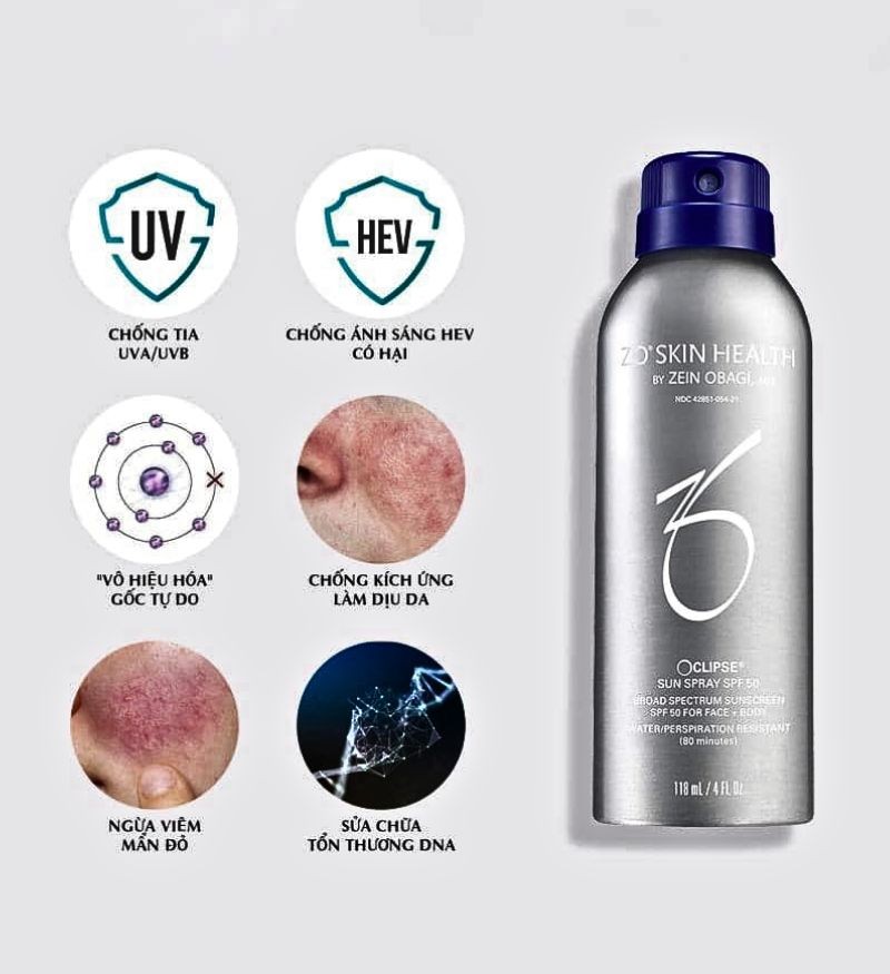 Kem chống nắng dạng xịt Oclipse Sun Spray SPF 50 nằm trong bộ sản phẩm Sun Protection thuộc thương hiệu Zo Skin Health nổi tiếng tại Mỹ. Tiết kiệm thời gian nhưng vẫn đảm bảo hiệu quả tối đa chính là tiêu chí hàng đầu của siêu phẩm này.